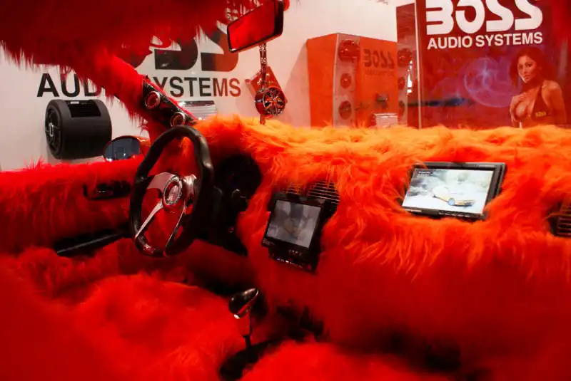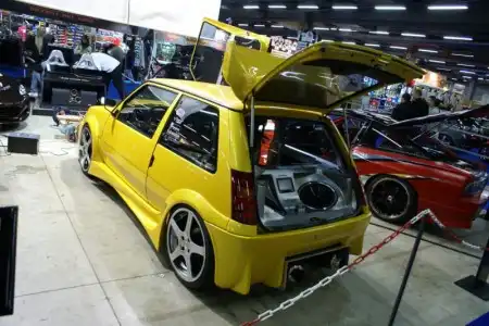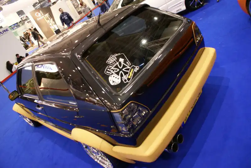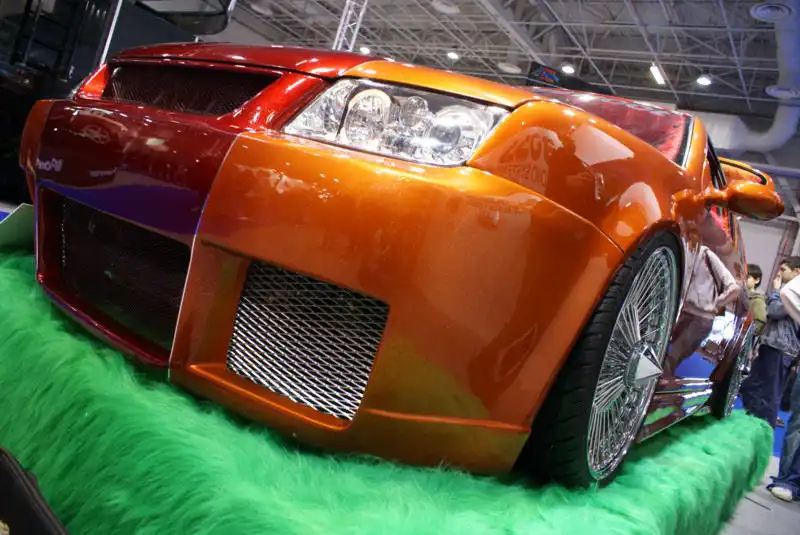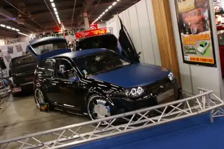 А тем временем мы обратим твое внимание на те стенды и автомобили, о которых не упомянули вчера. Для начала – несколько стендов, целью которых было издевательство над маркой VW. Первый, и самый запоминающийся «Гольф» был превращен в плюшевую игрушку. Внутри он полностью обшит ярким мехом. Снаружи – стандартный набор для обезличивания – морда от другого авто. В данном случае обошлось лишь оптикой от «Боры». Но гармония проекта вполне определяет его на первое место. Минус лишь один: шерстяной салон предпологает много пыли. И ее там действительно много. Пылесосить такой салон придется изо дня в день...