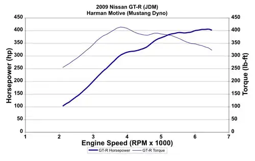Результат прогона Nissan GT-R на стенде Mustang оказался следующим: максимальная мощность — 406 л.с. на 6 400 об/мин, максимальный крутящий момент — 561 Нм на 3 800 об/мин.