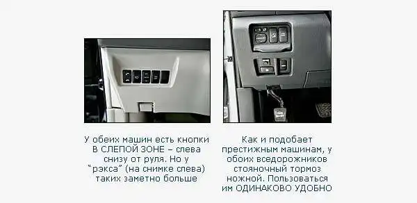 Штурвал «Лексуса» в плане пустить пыль в глаза вне конкуренции: кожа как будто богаче и дерево полированное. На деле по гладкой холодной полировке скользят руки. Вообще же, в отличие от FX, возраст «рэкса» замечаешь. Пульт регулировки зеркал зачем-то спрятали гораздо ниже, чем следовало бы, – где-то перед левой коленкой водителя. Там же, в слепой зоне, примостился выключатель парктроника. Нелогично – рядом расположены кнопки омывателя фар и управления пневмоподвеской. Регуляторы обогрева кресел мало того, что откровенно мелкие, так еще выглядят, будто их позаимствовали из начала 90-х. Да и простецкий, а-ля «Королла», ключ с железным жалом для престижного «паркетника» – моветон.