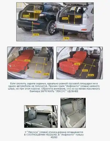 Даже удивительно, что найдется-таки ситуация, при которой трюм RX окажется в проигрыше. «Инфинити» может увезти троих и, например, небольшое (три с лишним метра в длину) каноэ в салоне. В «Лексусе» при той же поклаже поедут только двое. Дело в том, что инженеры «Тойоты» хотя и сделали разрезную в соотношении 40/20/40 спинку, но ее правую часть можно сложить только вместе с центральной.