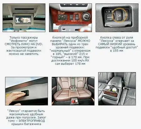 Но, пожалуй, гораздо важнее умение RX быть заботливее, даже когда речь идет о погрузке. Самому тягать тяжелую заднюю дверь ни к чему: за вас ее поднимет электропривод. У «Инфинити» такого нет. Другой плюс «рэкса» – менее массивный задний бампер: меньше вероятность испачкаться. Кроме того, только «Лексус» можно заставить еще и «присесть» – при помощи пневмоподвески корма опускается на 30 мм от нормального уровня. Пустячок, а приятно.