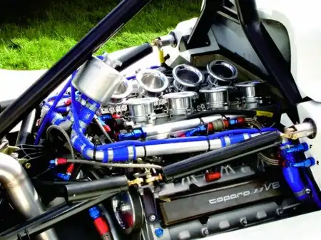 В основе кузова – сверхрпрочный и невероятно легкий «сотовый» монокок из карбона и алюминия. Мотор V8 собственной разработки Caparo расположен в базе и является элементом силовой структуры кузова. Агрегат объемом 3,5 л с сухим картером, алюминиевыми блоком цилиндров и головками блока выдает 575 л.с. на 10 500 об/мин при работе на обычном 98-м бензине. До таких оборотов не «крутится» ни один другой автомобильный мотор. Максимальный крутящий момент в 420 Нм достигается также на весьма высокой частоте вращения – 9000 об/мин. Электронный блок управления Pectel SQ6 ведает работой восьмидроссельного впуска с восемью сдвоенными форсунками. Специалисты Caparo утверждают, что на метаноле и с «отпущенным» до 12 000 об/мин ограничителем оборотов мощность поднимается до 700 сил. При этом силовой агрегат весит всего 116 кг (для примера: 4-литровый V8 от BMW M3 – 202 кг) и удовлетворяет современным экологическим требованиям.