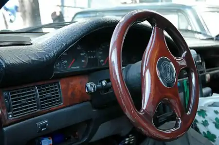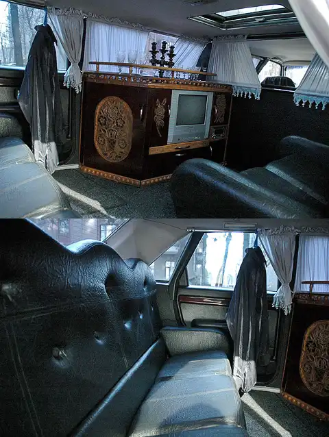 Внутреннее убранство поражает воображение ничуть не меньше. Создатель несомненно познал вкус сладкой жизни. Занавесочки с рюшечками, кожаные кресла, люк в крыше — всё это здорово. Центральное место в салоне занимает громоздкий резной комод с телевизором, канделябром и фужерами.