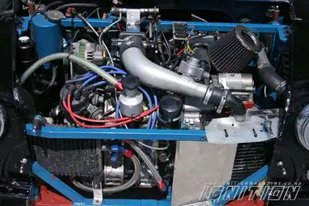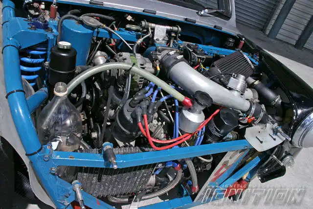 Специалисты решили использовать турбокомпрессор Series 5 от Mazda RX7 в связке с крыльчаткой компрессора типа T04b и 42-миллиметровым вейстгейтом. Охлажденный воздух подаётся через воздушный фильтр K&N и систему из сделанных на заказ труб. Ну а управление двигателем это компьютер Link и впрыск EFi, электронное зажигание и комплект свечей и проводом от NGK racing.
