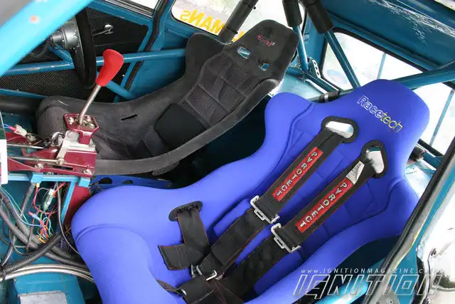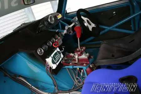 После всех этих манипуляций пришло время для работы над салоном авто. Первым делом были установлены два спортивных кресла Racetech с ремнями безопасности с креплениями в пяти точках. За состоянием автомобиля позволяет следить целый ряд приборов, начиная от указателя давления наддува до датчика давления масла и тахометра со шкалой до 10000 об/мин. Рядом с приборами уютно расположились блоки управления системами TurboSmart (система TurboSmart – очень умное приспособление благодаря которому давление, развиваемое турбокомпрессором, можно менять для отдельно для каждой передачи) и Link.