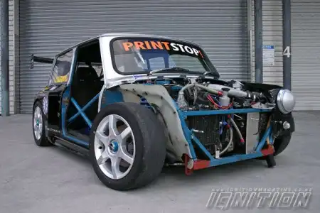 После того как основные работы были закончены, автомобиль был протестирован на стенде, где замерили мощность двигателя. Выяснилось, что под капотом этого маленького автомобиля прижилось «стадо» в 310 «голов». Для работы с таким поголовьем трансмиссия Mini была заменена деталями от ST190 Toyota Corona, установлен усиленный маховик и двухдисковое сцепление. Тормозная система автомобиля – элементы системы Mazda Series 4 RX7 спереди и комплект тормозных дисков от Suzuki GSX 1100 сзади.
