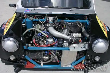 Кстати, говоря, о способности автомобиля держать дорогу. Кроме усиленной ходовой части, на этом Mini установлены стойки фирмы McPherson с амортизаторами Koni спереди и регулируемые стойки McPherson от Toyota AE92 сзади. 15-дюймовые легкосплавные колеса TSW EVO-R «обутые» в гоночные слики от Dunlop довершают конструкцию. В оригинале, в автомобиле устанавливался двухсекционный роторно-поршневой двигатель типа 12А, поэтому, замена двигателя не принесла дополнительных трудностей по переделке кузова. К сожалению, первый двигатель приказал долго жить на раннем этапе тюнинга, тогда, владелец решил поднять ставки и установить аналогичный двигатель, но уже усиленный системой турбонаддува.