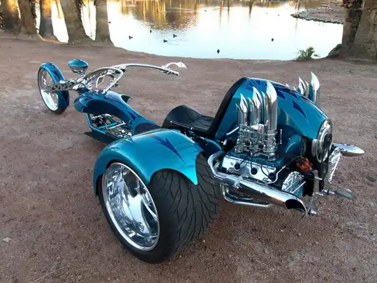 От Porsche 911 трайк унаследовал двухлитровый 6-цилиндровый двигатель и пятискоростную коробку передач. Кроме того, на этом аппарате можно увидеть глушитель ручной работы, кожаные сиденья, мощную аэрографию в "акульем" стиле, полированные амортизаторы из нержавейки, и т.п.