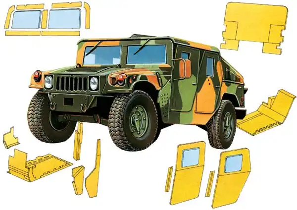 HMMWV M998A2 (4х4) — бронирование с помощью навесных панелей (1 — передние броневые накладки, 2 — защита багажника, 3 — защита днища, 4 — бронированные двери, 5 — защита картера и подкрылки). Масса без брони — 2,544 т, грузоподъемность — 1,25—1,5 т, двигатель — дизельный, 170 л. с., скорость по шоссе — до 113 км/ч
