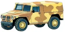 Так, в США после вьетнамской кампании решили отказаться от потомков «старины Виллиса» в пользу принципиально новой машины. Результатом стал едва ли не самый разрекламированный за последние четверть века военный джип HMMWV (аббревиатура, означающая «высокомобильное многоцелевое колесное транспортное средство»), заказ на который в 1983 году получила компания «Америкэн Моторс Дженерал». Эта машина известна также под прозвищем «Хамви» или под именем «Хаммер» («молоток»), хотя «Хаммерами» вообще-то зовут ее коммерческие модификации. Военный М998 HMMWV весьма удачно сочетал мощный дизельный двигатель, независимую подвеску колес с широкопрофильными шинами низкого давления и вставками для езды на спущенных шинах, широкую колесную базу, возможность передачи на колеса большого крутящего момента, большой дорожный просвет и небольшую высоту самого корпуса из алюминиевых сплавов. Также в качестве достоинств стоит упомянуть минимальные свесы корпуса впереди и позади колес, четырехместную кабину и довольно вместительное грузовое отделение. Правда, за низкий силуэт пришлось расплачиваться туннелем трансмиссии, занявшим значительный объем кабины. Характерно предъявленное к машине требование — водитель может управлять ею с ранением одной руки и одной ноги. Этому способствуют автоматическая коробка передач и набор органов управления. Поднятый над капотом воздухозаборник с воздушным фильтром увеличивает глубину преодолеваемого брода и улучшает работу в условиях запыления (сухая степь, пустыня). Семейство HMMWV имеет 15 базовых модификаций с общими шасси, двигателем и трансмиссией: 8 из них являются боевыми машинами, несущими на борту вооружение, остальные — санитарные, штабные и так далее. Всего в семействе используются 44 сменных модуля. Это позволило заменить не только основного предшественника — массовый джип М151, которого HMMWV превзошел по грузоподъемности почти втрое, — но и целый ряд машин и значительно унифицировать автопарк соединений. Различные модификации «Хамви» служат более чем в 30 странах, хотя это едва ли не самый дорогой военный джип на планете.