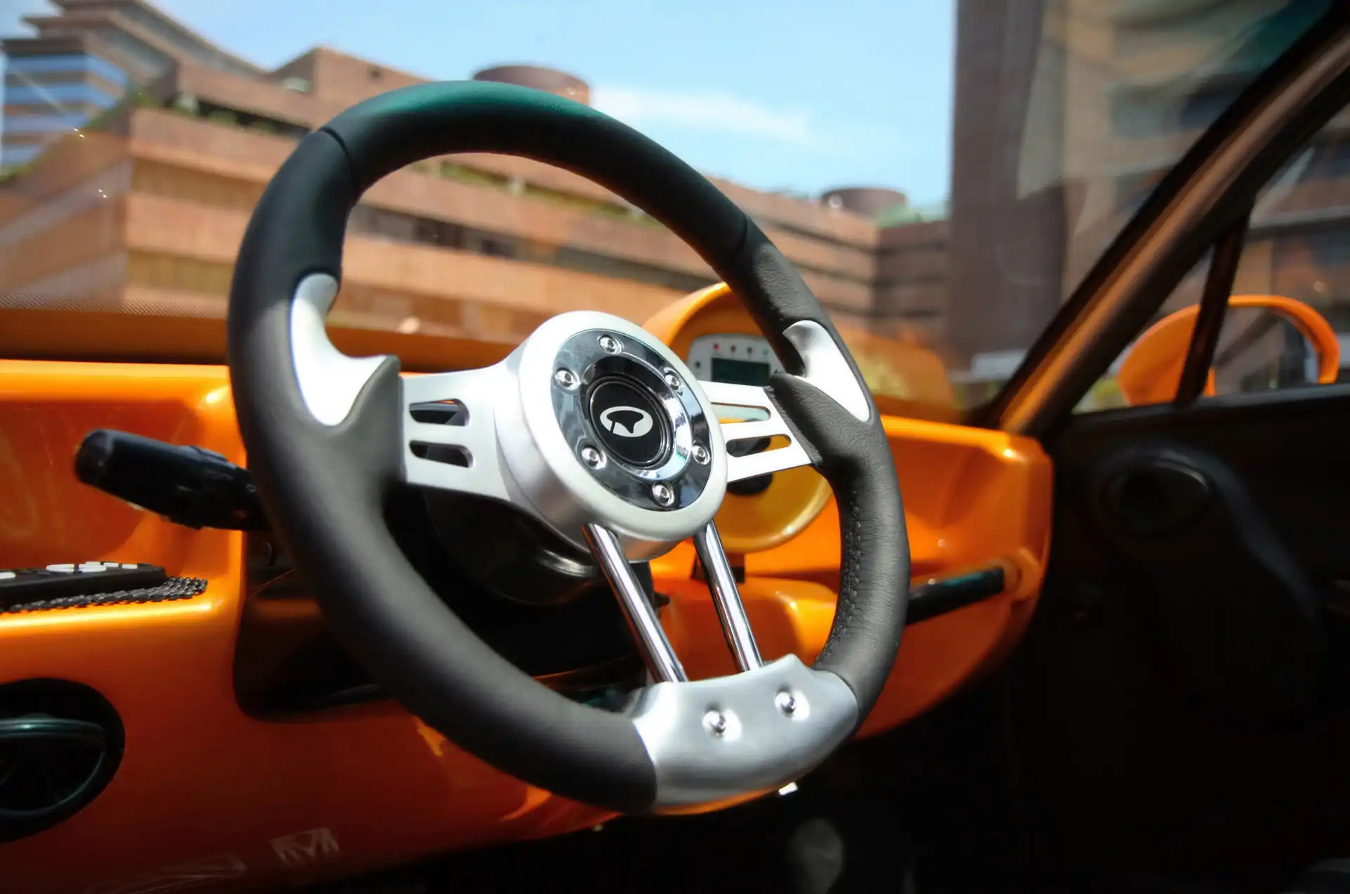 Выглядит MyCar, конечно, поприятней подобного TH!NK city, но вот основные пропорции те же мультяшные. Кузов выполнен из пластика, а каркас из металлических трубок. Подвеска, кстати независимая, как передняя, так и задняя.