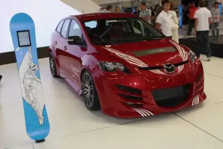 Mazda тоже не обошла вниманием тему тюнинга. На просторном белом стенде с белыми же машинами единственной ярко-красной оказалась специально подготовленная для заездов по Нюрбургрингу CX-7. А ещё был чудо-концепт Mazda Kazamai, просто глаз не отвести.