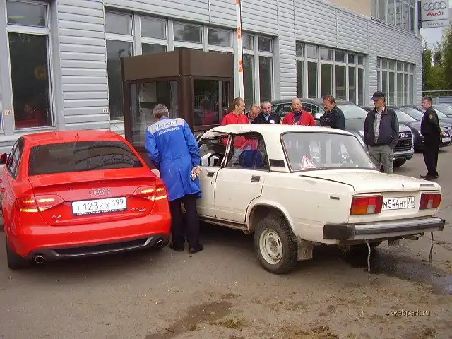 Водитель ВАЗ-2105 на новой зимней (31 августа) резине не вписался в поворот, вынесся на газон, вместо тормоза со страху нажал на газ, и на естественном ландшафтном трамплине воспарил над забором сервисного центра Ауди (Независимость), задел его задними колесами, и аккуратно приземлился носом в будку охранника, и левым колесом в новенькую аудюшечку (клиентская, меньше 400 км. пробега). Водитель пятерки устные разъяснения давал с трудом и с забавным кавказским акцентом. Очевидцам почему-то было не смешно.