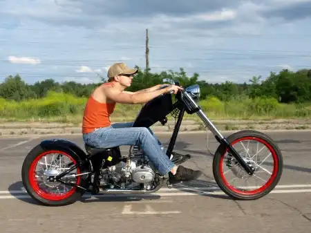 Задумав проэкт COOLDRUG CHOPPER, я понял что так просто моя затея не обойдётся, и купил сварку-болгарку. Без стапеля конечно было тоже не обойтись, трубогиб, "английское колесо", на это ушло месяца три-четыре... После чего нашелся двигатель ИМЗ. С задним ободом и резиной помогли ребята из ART MOTO г.Кировоград,за это отдельное им спасибо! Раму делал по началу на глаз,собрал на прихватках, поставил на колёса, всё понравилось,потом выставил и обварил в стапеле. Долго не мог найти б.у. амортизаторы от HD softail, они в нём на растяжку работают, пришлось напряч сестрёнку в Германии,там с этим барахлом попроще. Приехали два,но место нашлось только для одного,зажал не много пружину, получилось то что надо. Когда встал вопрос с баком,заехал к ребятам в мастерскую по изготовлению рыцарских доспехов. Через пару дней вернулся с раскроеным листом метала, получил короткий ликбез, и после соттысяч ударов молотком получился бак. Скрутить переднее крыло с небрежно припаркованного в тёмном переулке трактора "Беларус" не удалось. Нашол базу, купил, перекроил и подогнал по радиусу. Потом была покраска и сборка.