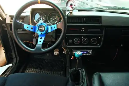 В стоке у таврии очень спартанский салон, в духе английских корчей типа Caterham, Володя, хозяин дьяволенка, не стремится к излишнему комфорту поэтому заменил только самое необходимое. Водительское сидение успешно заменено на ковш Recaro, пасажирское на сидение от Honda Civic. Так же удивительно неудобный стоковый руль уступил место раллийному рулю Prosport с выносом. В стандарте у Таврии не очень удобная комбинация приборов - здесь немногим удобнее. Зачем-то сделано 2 тахометра: шикарный Autogage и убогий от ВАЗ 2106. Правда очень неплохо расположены приборы давления масла, температуры и уровня топлива – на центральной консоли. Чуть ниже нашлось место и для головного устройства Kenwood.