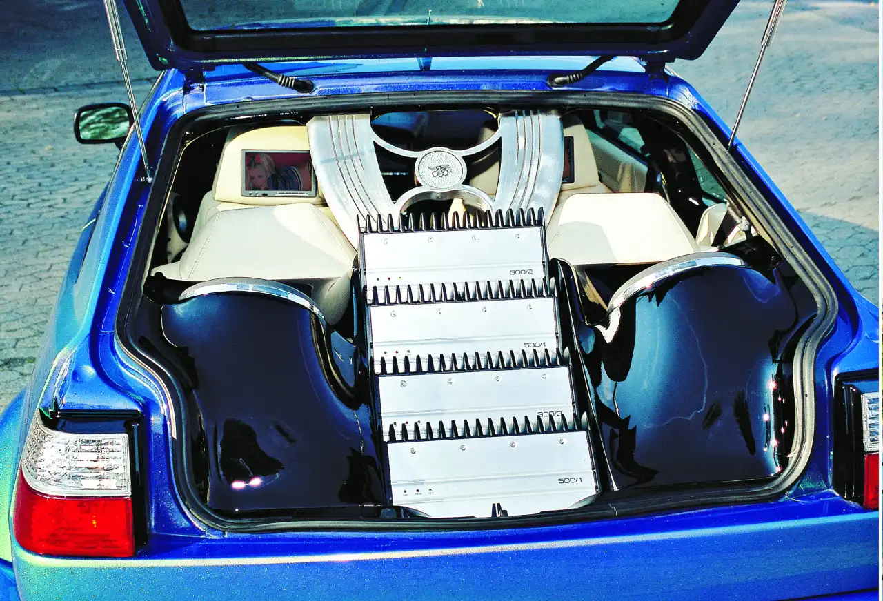 Мультимедийная система в этой тачке достойна отдельной публикации. Чего стоят хотя бы подиумы дверей. Парни решили не покупать готовые дверные панели с подиумами под мидбасы, а пошли старомодным путем – сделали сами. Три среднечастотника наполняют музыкальную сцену, а четвертый направлен на слушателя, для тонкой передачи аспектов мелодии. Тут же – «блин» 6x9, чтобы придать звуку немного «мяса». Немного, ибо в багажнике смонтирована впечатляющая инсталляция, служащая корпусом для двух 15- дюймовых сабвуферов, а также подиумом для каскадного размещения четырех усилителей. Пара трехсотваттных – для фронта и по пятьсот ватт – на каждый саб. С таким звуком Playstaition 2, зачем-то висящая на потолке, промеж голов задних пассажиров – не более чем баловство.
