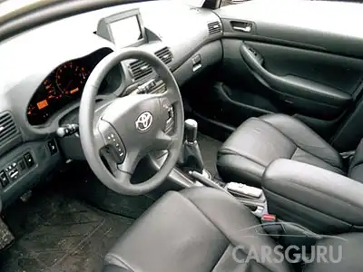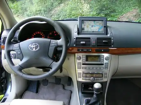 В Toyota Avensis, соответствующей нашему стандарту "1 Av", настоящий кожаный салон. Цвет обивки -- черный, с едва заметным серым отливом. Из такого же материала выполнена обивка дверей. В салоне -- неброские панели под дерево. В сочетании с хромированными внутренними ручками замка дверей смотрится скромно, но со вкусом. Водительское сиденье имеет все необходимые регулировки, даже по высоте, но манипулировать ими надо вручную. Небольшой "бардачок"-подлокотник между передними сиденьями вмещает необходимый дорожный минимум.