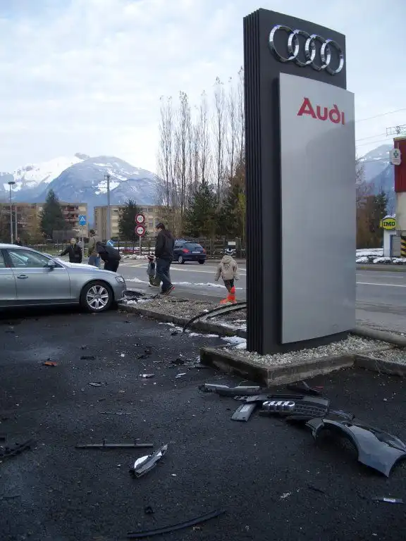 В небольшом швейцарском городке, 18-летний парень на Renault Kangoo не справился с управлением и разбил 5 новых автомобилей Audi. Авария произошла в 4 часа утра и причиной было превышение скорости (он ехал со скоростью более 100 км/ч, при разрешенных 50 км/ч). В какой-то момент машина заехала на тротуар и на полном ходу влетела в магазин Audi.