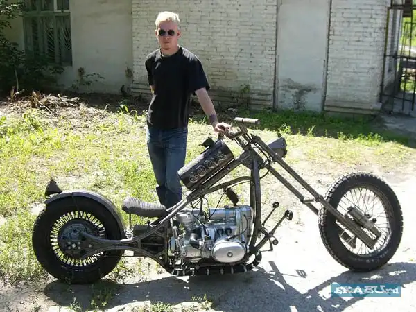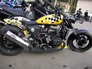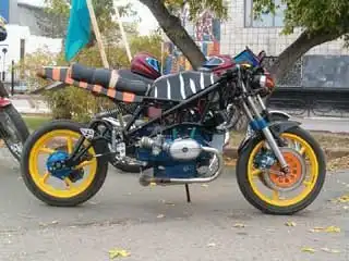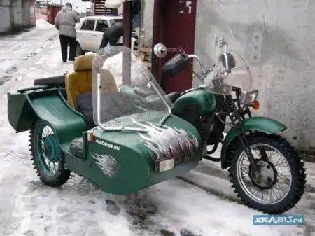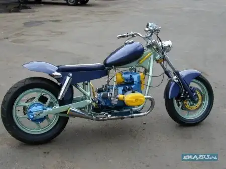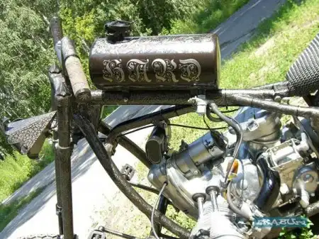 Аксессуары: руль от старого Днепра, стойки , рукоятки руля custom, крыло переднее от старого Кавасаки, крыло заднее от Ямаха Вираго, передняя вилка с мостами (основа старый Кавасаки), рулевая колонка , подножки Custome Chrome (CC), кардан Урал "Волк", маятник , седло - временное,
