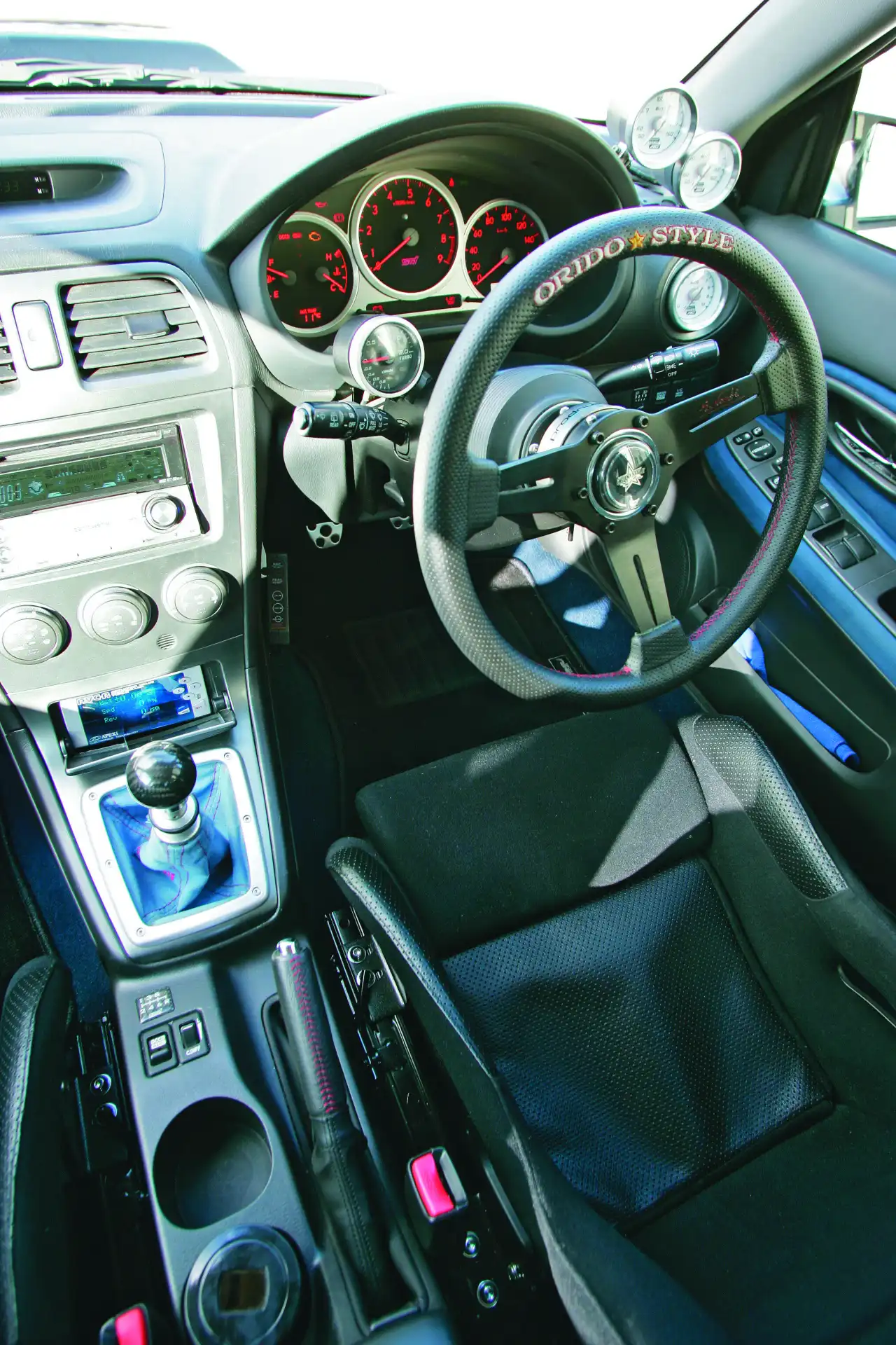 Наметившийся баланс между тюнинговой модой и спортивными решениями продолжается и в салоне. Да, это именно салон, до кокпита тут далековато. От спорта тут – лишь отличный руль Ridox да пара ковшей Varis. А дополнительные приборы Blitz, один из которых заткнул правый воздуховод – типично тюнерское решение. Можно было бы вварить каркас безопасности, но ведь это лишь демокар, да и в требованиях класса street в "time attack" он как обязательный пункт не значится. На этом этапе господин Яхаги посчитал проект завершённым. А чтобы узнать фактичексий результат от всех проделанных работ, за руль пригласили Мицухиро Киношита, пилота гоночной серии Super GT 300 и отправили на профессиональную трассу Цукуба. Под его пилотажем эта Impreza, обутая, кстати, в гражданскую резину, показала лучший круг в 1 минуту 02 секунды – и это с аудиосистемой, кондиционером и навигацией на борту! Что тут сказать - славная работа, Тадао!
