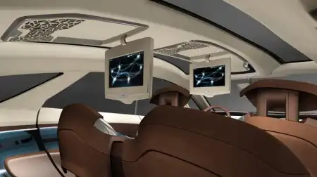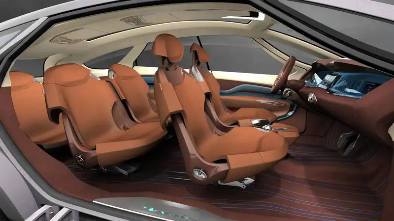 Распашные двери открывают лёгкий доступ в шестиместный салон — ещё один предмет гордости корейцев. А что, получилось мило! Пол с эффектной текстурой, бежевые и «коньячные» цвета отделки, богатая передняя панель. Но «фишка» не в этом. Она — в трансформации салона и его мультимедийных возможностях (их обеспечила компания LG). Посмотрите, кресла вращаются вокруг вертикальной оси! Раз, и пассажиры оказываются лицом друг к другу. Достают игровую приставку, сумку с DVD, подключаются к Интернету, раскладывают еду, разливают огненную воду по стаканчикам, и начинается досуг по-корейски для европейцев. Заманчиво! Если тесно, кресла второго ряда можно сдвинуть назад. Кстати, у вращающихся сидений фирменное название — Swivel Seat. Они разрабатывались в недрах ещё одного партнёра проекта — немецкой инжиниринговой компании Keiper. Как видите, ощутима интеграция европейских производителей в корейский концепт.