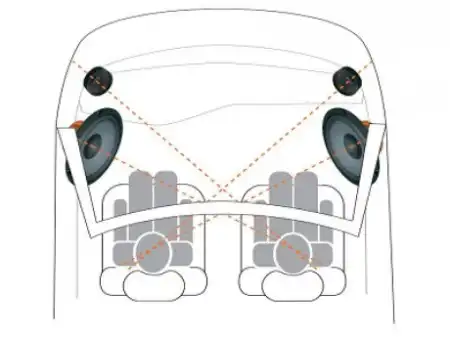 Вынесение головок акустических систем максимально вперед и на нужной высоте вкупе с особенностями конструкции и характеристик звучания автомобильной техники позволяют эффективно бороться с неблагоприятными акустическими условиями. В данном примере использована перекрестная ориентация головок на слушателей, это один из приемов уменьшения разницы в дистанции от слушателя до динамиков левого и правого каналов. Есть и множество других приемов и вариантов ориентации.