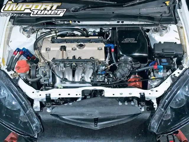 Может показаться, что система управления двигателем Mugen – это перебор для обычной Хонды с выпускной системой "cat-back". Но разве речь идет об обычном автомобиле? Штатный двухлитровый двигатель K20 выдавал 220 лошадиных сил, но этого Buddy Club показало мало, так что стоковый мотор был полностью разобран, а собрали его с новыми поршнями с более высокой степенью сжатия 13:1, коваными шатунами, распредвалами Buddy Club Spec III. Двигатель был тщательно отбалансирован, в результате чего его мощность теперь достигает 259 сил на колесах. K20 питается исключительно гоночным бензином через топливную систему Mugen, а отработавшие газы выпускает по выхлопной системе Buddy Club P-1 Racing Spec, которая также способствует увеличению мощности, хоть и представляет собой, по сути, прямую трубу с глушителем.