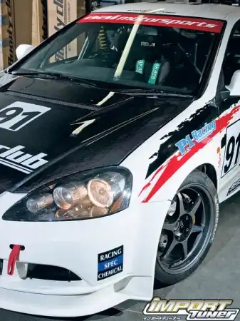 Несколько месяцев назад мы заехали в головной офис Buddy Club USA, дабы наконец оценить новый гоночный Type R. Автомобиль покоился в самой глубине складского помещения, среди груды гоночных сидений, колесных дисков и прочего добра. Легким движением руки сняв с машины брезентовый чехол, Кевин Фэн представил нашему взору новейший демо-кар Buddy Club. Несколько секунд мы, не говоря ни слова, рассматривали линии кузова Type R – общий вид машины сильно отличался от того, что мы готовились увидеть. Кузов очень грамотно и приятно расширен, линии ровные и плавные, ни одного неуместного острого угла. Белое покрытие подчеркивает все достоинства нового обвеса. Кузов обрел великолепные аэродинамические характеристики, закрыв расширенными колесными арками "липкие" гоночные шины на 17 дюймов и легковесные кованые колеса Buddy Club P-1 Racing QF. Хорошие новости для постоянных клиентов Buddy Club: подвеска DC5 была дополнена стабилизаторами поперечной устойчивости от Mugen и гоночными амортизаторами Buddy Club P-1. Дополнительная доводка жесткости пружин, гоночная клапанная система, выносные бачки, где нужно, - все это может быть вашим. Не бесплатно, конечно.