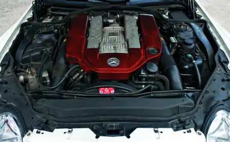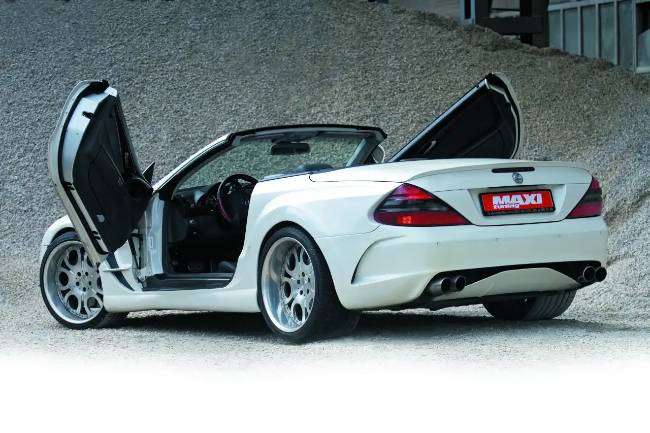 Стандартный пятилитровый V8 на стоковом дорестайлинговом SL развивает 306 лошадиных сил. Увеличение мощности на перламутровом купе-кабриолете достигалось традиционным для Штуттгартских мотористов способом, то есть при помощи компрессора, который позаимствовали у придворного ателье AMG. Впрочем, он тоже подвергся усовершенствованию и обзавелся увеличенным шкивом. Увеличились также дроссельная заслонка и диаметр коллекторов. Кроме того, на автомобиль был установлен более эффективный интеркулер. Очевидно, что возросшая мощность повлекла за собой перепрограммирование "мозгов". Выпуск остался штатным, но лишился катализаторов. Звучит он, надо признать, воинственно. Иначе не скажешь.