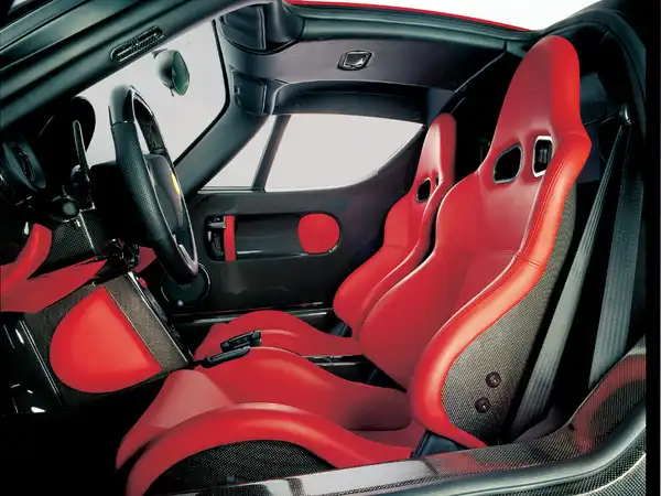 Сиденья-ковши, вставки в дверях, под передней панелью и на центральной консоли обиты зеленой кожей, а сама панель сделана из углеволокна. Маленькое рулевое колесо (тоже из углеволокна) слегка «приплюснуто» сверху, где размещены светодиоды, позволяющие контролировать работу секвентальной коробки передач. Педали сцепления нет, как нет и привычного рычага КП. Передачи переключаются двумя подрулевыми рычажками: один — «вверх», другой — «вниз». Желтые циферблаты спидометра и тахометра размечены до 400 км/ч и 10000 мин-1 — многообещающие цифры!