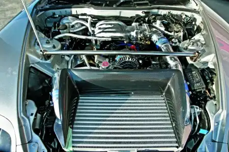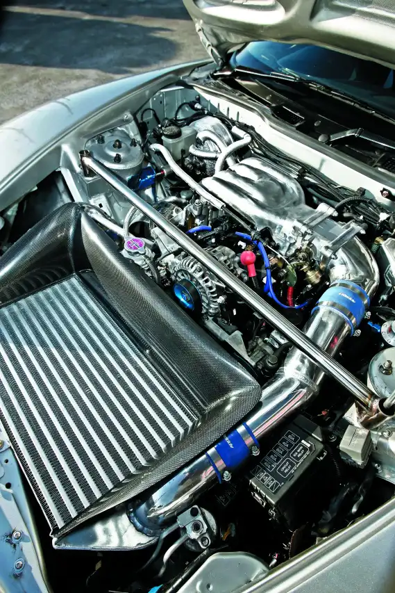 Нас всегда привлекали своей красотой горизонтальные интеркулеры. Но тот, что стоит здесь, пожалуй, самый красивый и эффективный. Это фирменное изделие RE Amemiya напоминает скорее охлаждаемый бокс для фруктов, нежели серьезное тюнинг-устройство. Схема его работы стандартна: воздух, проходящий в центральное отверстие переднего бампера, протягивается через интеркулер и удаляется через прорези в капоте.