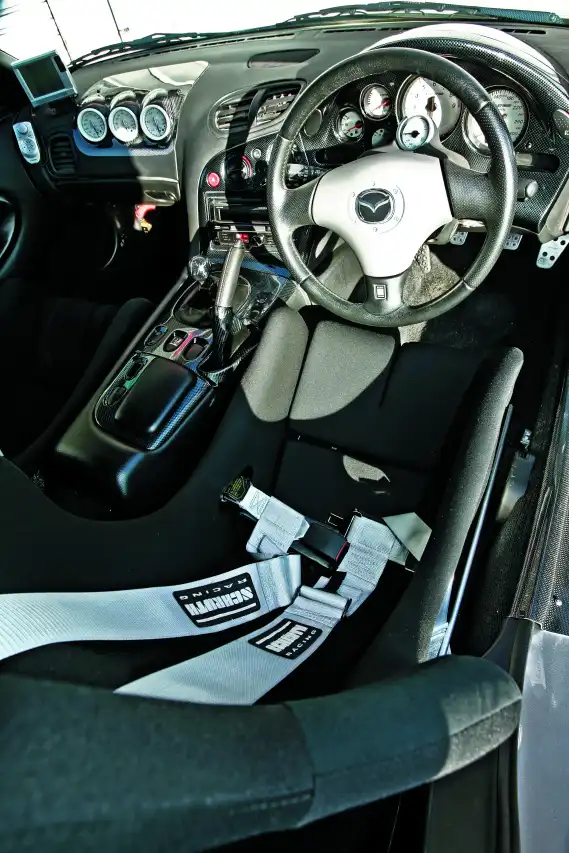 Но отказываться от творческих заказов неправильно, поэтому работа закипела. Несмотря на то что итоговую мощность в 450 лошадей можно было бы легко снять и с родного блока 13B, в ателье Амемии пошли проверенным путем, поставив трехсекционный блок 20B от Mazda Cosmo. Во-первых, почти любой мощный мотор, построенный на 1,3-литровом роторе, отдает максимальные параметры в верхней части оборотов, а для города это неправильно. А во-вторых, машина, созданная для подобных целей, должна иметь какой-никакой ресурс, с чем, опять-таки, блок 13В справляется с трудом. Обе эти проблемы и был призван решить "космовский" блок. Стандартная битурбовая схема с давлением в обеих турбинах 0,7 бар была заменена в ателье Амемии на схему с одной турбиной, в роли которой выступила турбина Trust TD07H-25G. Все эти переделки стандартны для RE Amemiya, ведь по схеме "мотор Cosmo + монотурбо Trust" были построены все проекты Super GReddy.