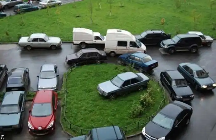 Жильцы соседних домов, которым это не понравилось, вызвали эвакуатор, заплатили водителю чуть больше и тот согласился поставить ее на клумбу посередине. Интересно было бы посмотреть на хозяина автомобиля, который обнаружил его в таком положении )
