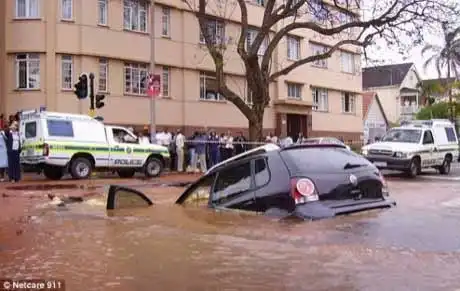 Среднестатистический гражданин ЮАР купил автомобиль Volkswagen Polo и отправился в свою первую поездку по городу Дурбан. Надо же было такому случиться, что за несколько минут до его проезда грунтовые воды размыли асфальтовое покрытие и машина ушла под воду. Водитель спасся, успев покинуть тонущую машину.