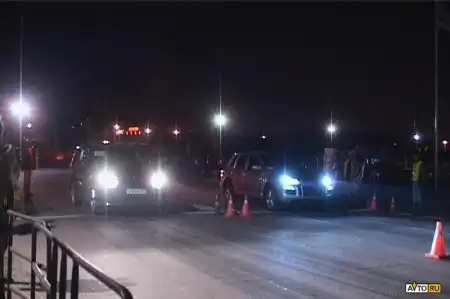 Думаете это все? Нет, почти перед самым концом гонки к нам подошел мужчина и спросил: «А не хотите погоняться с Porsche Cayenne Turbo?». О таком счастье мы и мечтать не могли, новый Cayenne Turbo, 500 турбированных коней против 432 атмосферных, 4,8-литра против 6,1-го, 700 Нм против 569 Нм и, наконец, 5,1 паспортная секунда до 100 км/ч против 4,7 у Jeep. Согласие можно было прочитать лишь по одному горящему взгляду. Специально для нас в конце соревнований устроили показательный заезд. Ведущий задорно сообщил публике: «На старте шестилитровый Jeep Grand Cherokee SRT8 против «турбового» Porsche Cayenne». Старт, заминка у Jeep, резкий рывок вперед, и вдруг Porsche Cayenne резко остается позади, на видео видно, как в конце он даже ударил по тормозам. Что же произошло? Ведущий произнес, что победа осталась за Jeep Grand Cherokee SRT8, но мы подошли к хозяину Porsche. Тот с грустным видом ответил, что принял заминку на старте как свой фальстарт, поэтому под конец нажал на тормоз. Верить ему или нет, мы так и не поняли, но на душе осталось легкое разочарование, ведь выяснить, кто быстрее так и не удалось…
