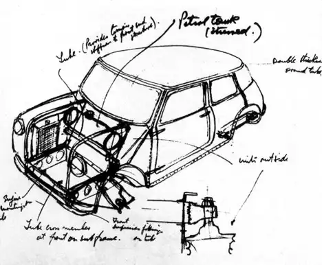 Чтобы выполнить эти требования, Иссигонис пошёл на революционный шаг. Новая модель имела передний привод, а мотор разместился поперёк кузова — эта схема впоследствии станет общепринятой на переднеприводных автомобилях. Трансмиссию создатели запихнули в картер, а радиатор поставили не перед двигателем, а сбоку от него. В таком положении радиатор обдувался потоком воздуха, уже прошедшим мимо мотора и успевшим нагреться, но зато длина машины оставалась в установленных пределах. В миниатюрный автомобиль спокойно влезало 4 человека и даже оставалось место для багажа. Крошечные 10-дюймовые колёса позволили избавиться от больших колёсных арок. Наконец, ради экономии места обычные рессоры были заменены коническими резиновыми блоками. Конструкция машины позволяла ездить с открытым багажником, тем самым увеличивая объём перевозимого груза. Особенностями конструкции также были внешние сварные швы и открытые дверные петли, позволившие снизить стоимость производства. Первый прототип был готов уже к октябрю 1957 года.