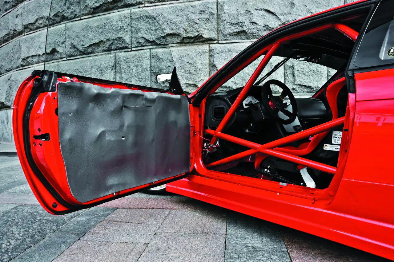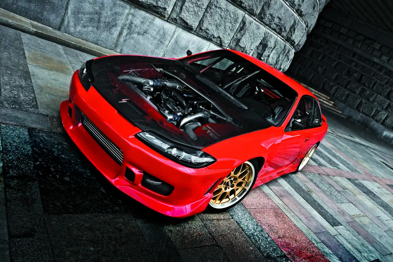 В новом пожарно-красном цвете, покрывающем все поверхности снаружи и внутри, до которых смог добраться краскопульт, S-14a выглядит просто фантастически сексуально. Огромную роль в создании горячего образа играют широченные кованые 18-дюймовые золотые диски BBS RG-R. Поклонники данной разновидности транспортных средств заметят еще одну особенность, великолепно выделяющую автомобиль на фоне соплеменников. Заметна эта особенность, если обойти автомобиль кругом и сравнить корму и нос, после чего становится понятно: кузов стоически перенес новомодную пластику "лица" и стал, возможно, первым 200SX в России с пересаженной передней частью от пятнадцатой "сильвии"! (вторая – у Тимофея Кошарного из CHE Drift Team). Детали передка, правда, не стоковые, а от японского кузовных дел мастера C-West, с редко встречающимися на просторах России аэродинамическими карбоновыми сплиттерами на переднем бампере, которые создают дополнительную прижимную силу. По заверениям C-West, бодикит продут в аэродинамической трубе и действительно работает. Кстати, первоначально пытались установить обвес Origin Aggressive Line, но он не подходил по размерам, да и качество оставляло желать лучшего.