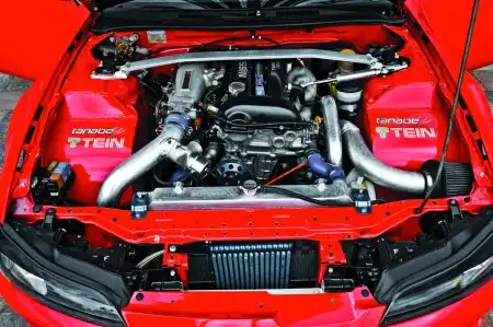 Четвертый – надежность, в основе которой лежит, прежде всего, хорошее охлаждение двигателя. Это действительно важно, ведь мотору в своем максимальном режиме приходится работать в отсутствие встречного потока холодного воздуха. Поэтому в системе охлаждения не оставили стандартных деталей, а установили: интеркулер Type R от GReddy, дополнительный радиатор Mocal на гидроусилитель, огромный 19-рядный масляный радиатор GReddy и заменили стоковый радиатор на "холодильник" Koyo. Сняли стандартный механический вентилятор, который, естественно, уже не справлялся с пылом четырехсотсильного SR20DET, и вместо него установили экономящий мощность электрический от Spal, который включается только по мере необходимости.