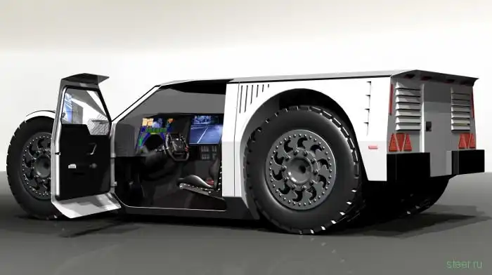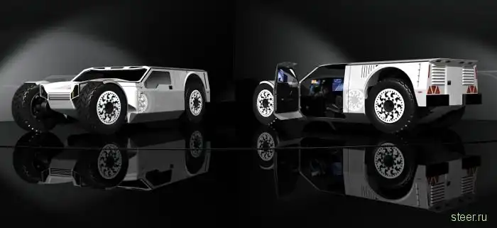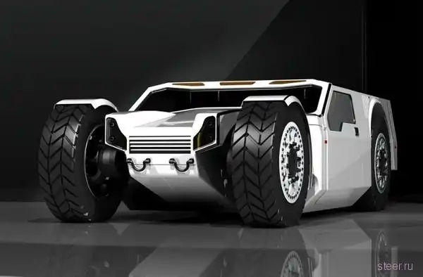 В салоне – гоночные кресла, огромный тач-скрин-дисплей для штурмана и многофункциональный штурвал для водителя, который не только крутится, но и отклоняется в стороны – для управления функциями подвески.