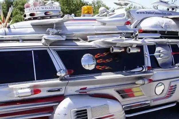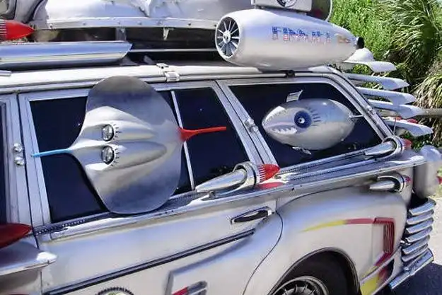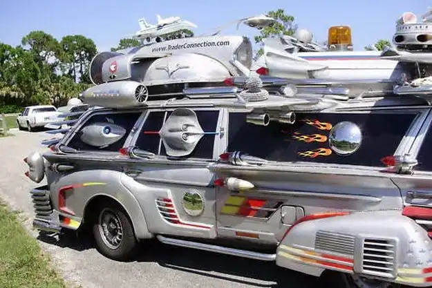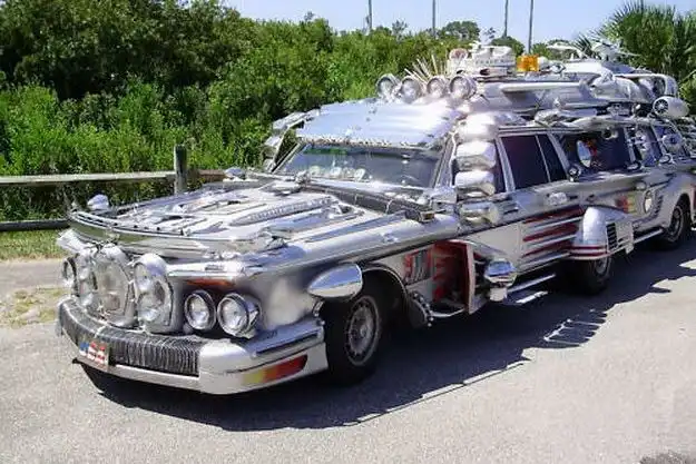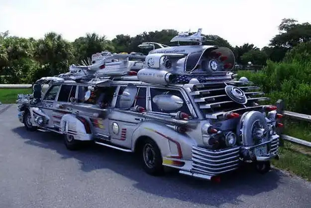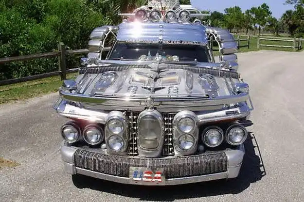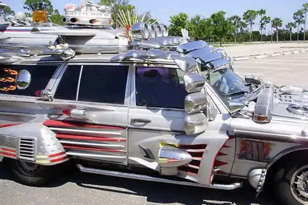 10-местный салон, 29 футов в длину (или примерно 8,9 метра) и 3402 килограмма. Этот монстр собран из запчастей от более чем 40 автомобилей, включая 86 фары и 36 зеркал.