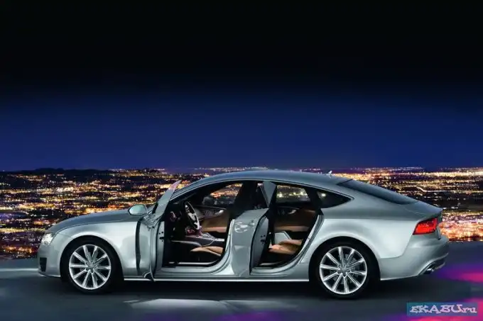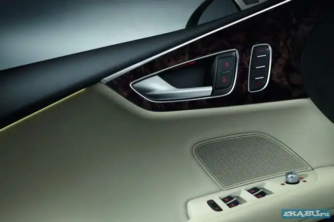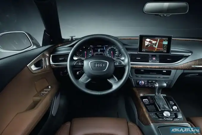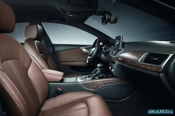 В салоне Audi A7 благородсвует кожаная обивка, а также отделка из натурального дерева. В центре передней консоли возвышается выдвигаемый экран