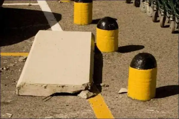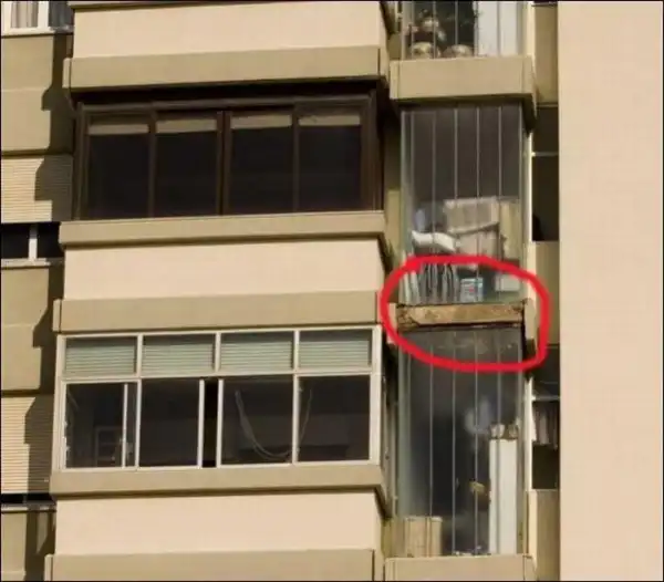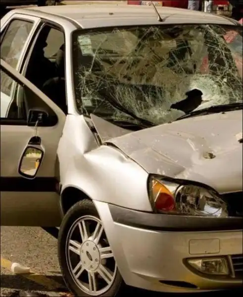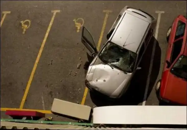 Этот старенький форд фиеста был покалечен плитой, которая оторвалась от балкона на одном из высших этажей