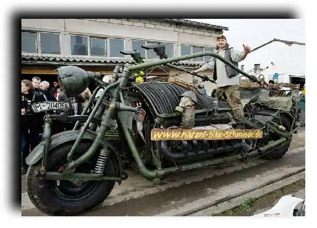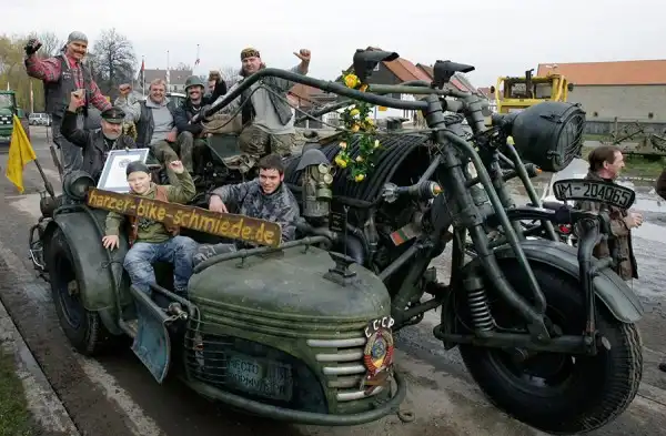 В руки мастеров немецкой компании Harzer Bike попал двигатель от советского танка Т-55. И команда во главе с Тило Нёйбелем соорудила на основе этого двигателя немецкий мотоцикл с коляской времен войны. Коляску украсил герб СССР.