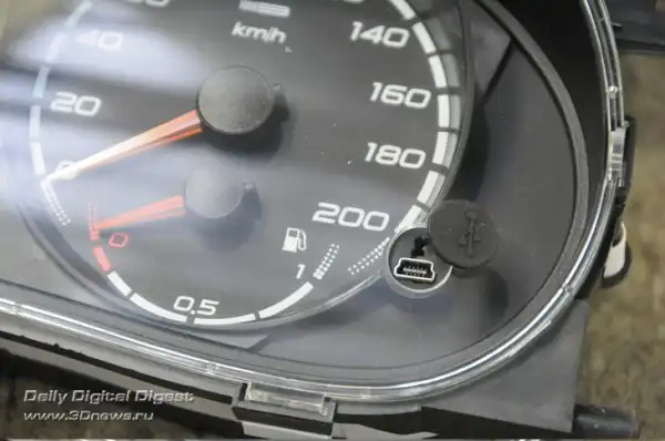 Панель «Итэлмы» имеет очень приятный дизайн шкал и вообще всего оформления, кроме того, антибликовость обеспечена не только изгибом козырька, но и помещением тахометра и спидометра в индивидуальные «колодцы». Дисплей размером 4,3 дюйма с вертикальной (портретной) ориентацией расположился прямо посередине. Для навигации, кстати, такая ориентация даже удобнее горизонтальной, так как позволяет видеть маршрут в большей перспективе. Внизу справа расположили прикрытое резинкой гнездо miniUSB — и это совершенно необычное решение! Как правило, USB-входы размещают в «бардачке», где они не торчат вызовом нормам безопасности. Китайские производители делают miniUSB-гнёзда прямо на лицевых панелях CD-ресиверов, но это незамысловатый трюк: флешек с таким разъёмом всё равно нет, придётся пользоваться переходником на проводе. А это уже на безопасность не влияет. Вот и «Итэлма» не стала делать полноценного USB, ограничившись mini. Всё равно этот вход имеет сугубо технологическое назначение (обновление карт и прошивок) и ежедневно не используется.