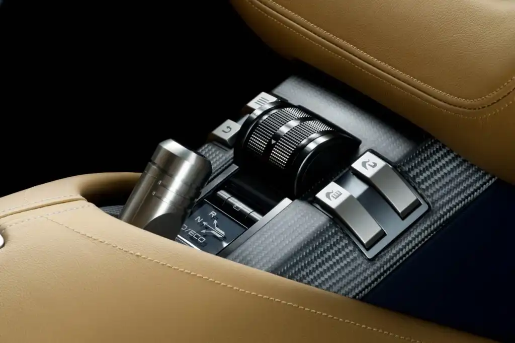 Сиденья обиты кожей и перфорированной замшей золотистого оттенка, в то время как для отделки дверей используется кожа и замша тёмно-голубого оттенка. Сочетание голубого и золотистого оттенков, напоминающее искры, повторяется в отделке панели управления. Для ее оформления также используются вставки из серебристого карбона, На панели также установлены четыре многофункциональных ЖК-дисплея.