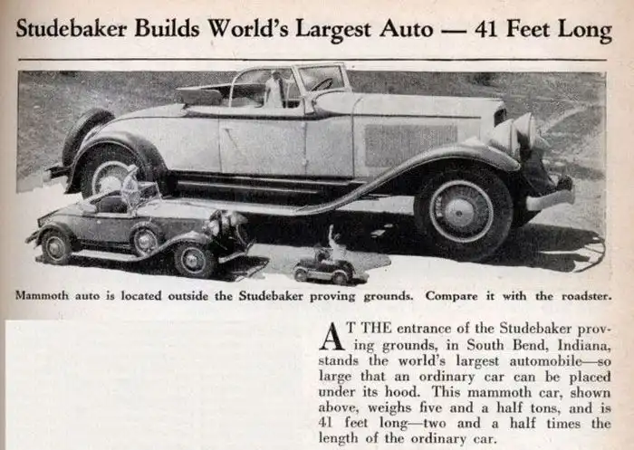 «Самый крупный в мире производитель транспортных средств!» — так звучал слоган американской компании братьев Клемента и Генри Студебекер (Studebaker) в 1872 году. Тогда они и впрямь были самыми большими, хотя делали фургоны, да повозки. Когда же наследники Студебекеров занялись автомобилями, одна из их машин также стала самой большой в мире.