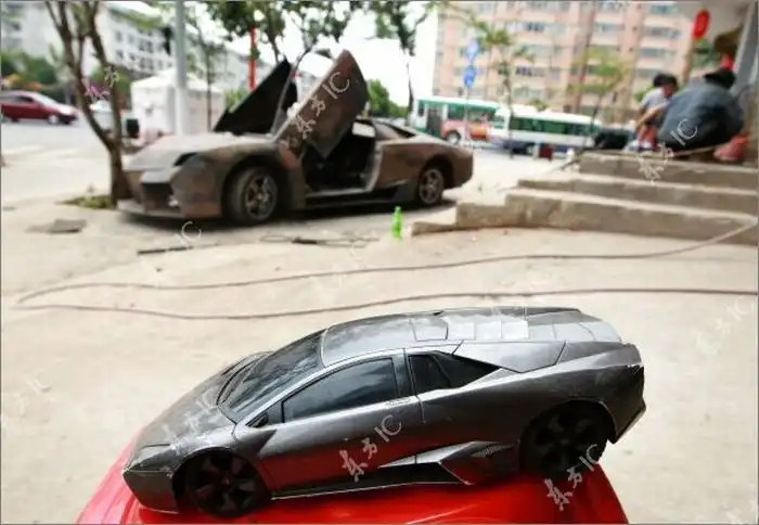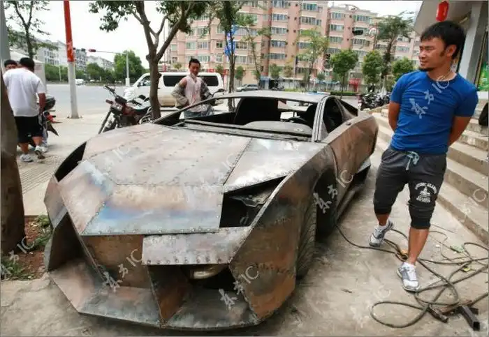 Lamborghini Reventon стал идолом для китайского парикмахера и он мешал ему спокойно жить. Но т.к. в китайской провинции довольно проблематично настричь людей на почти 2,5 млн.$, то пришлось выкручиваться по другому, чтобы стать обладателем мечты! Для этого паренек нанял трех сварщиков, дал им модельку, точную копию его мечты, ну ту, что на главном фото и свой старенький Nissan. Через некоторое время гуру сварки предоставили заказчику его мечту! Теперь осталось его покрасить и будет Lamborghini Reventon Kolhoz Edition.
