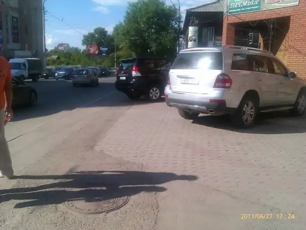 Вот несколько примеров того, как водители доргоих иномарок относятся к пешеходам, бросая свои машины на тротуаре, и совсем не заботясь о том, что людям трудно преодолевать такие препятствия. При мне женщине с коляской пришлось выйти на тротуар, рискуя быть задавленной вместе с ребенком.