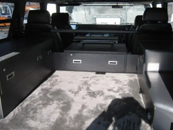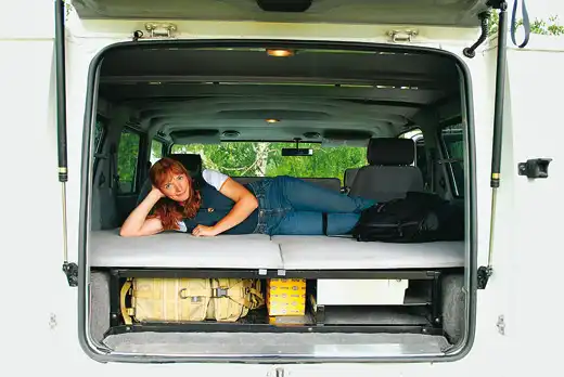 В салоне прежний японский хозяин добавил только кровать в багажнике. Для этого в пространство между колесными арками была положена быстросъемная железная конструкция, делающая багажное отделение двухуровневым. А сверху нее в распор легли четыре деревянные панели с мягкой обивкой.