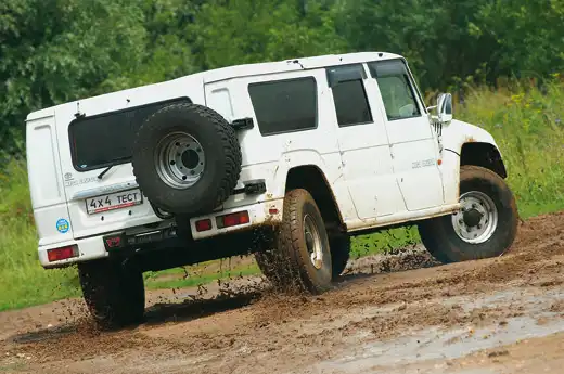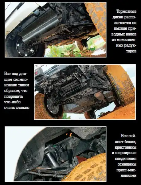 Все тормозные механизмы дисковые вентилируемые. Для уменьшения неподрессоренных масс они расположены на приводных валах, а не внутри колес. Поскольку у нас на тесте побывала гражданская версия, то в ней отсутствовала централизованная подкачка колес. Хотя трубки для нее были на своих местах.